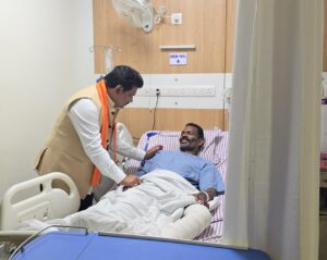 रायपुर – उप मुख्यमंत्री श्री विजय शर्मा आज रायपुर के निजी अस्पताल पहुंचे, जहाँ उन्होंने जिला बस्तर के भैरमगढ़ थाना क्षेत्र में हुए नक्सली मुठभेड़ के दौरान आईईडी ब्लास्ट की चपेट में आए घायल पुलिस जवानों से मुलाकात कर उनका हाल जाना और चिकित्सकों से उपचार की जानकारी ली। उन्होंने घायल जवानों से घटना की जानकारी ली और दिवंगत हुए उनके साथी जवानों के लिए संवेदना व्यक्त की।