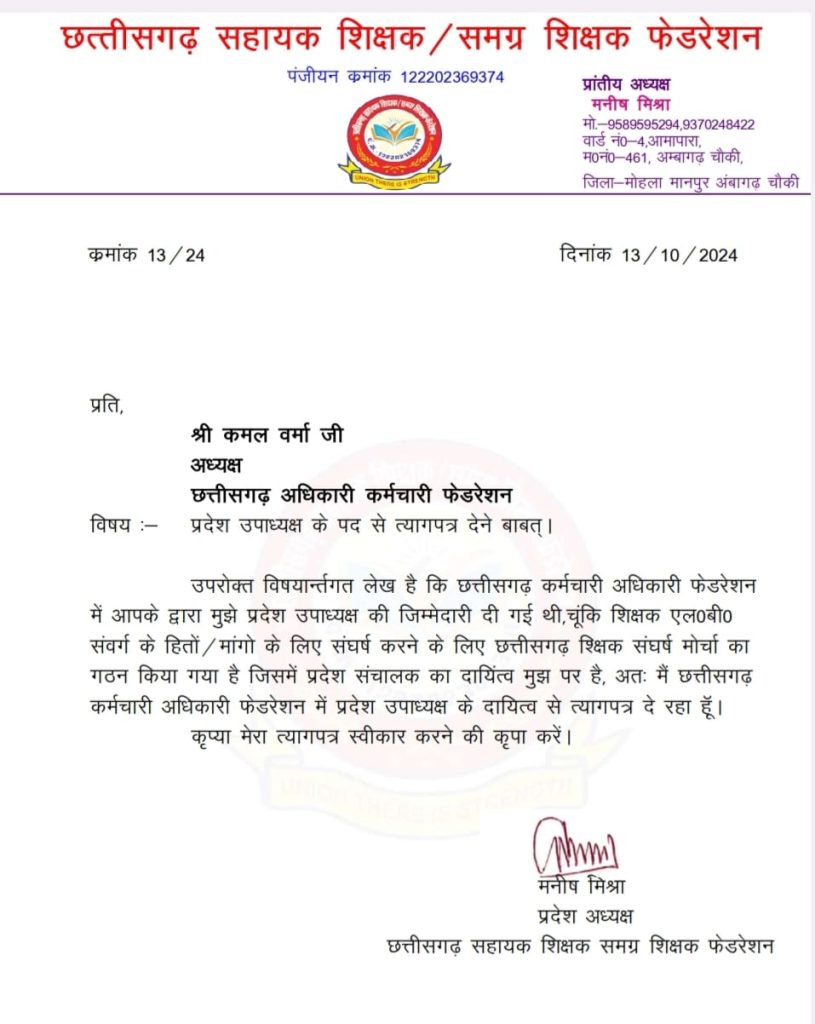 रायपुर।छत्तीसगढ़ कर्मचारी अधिकारी फेडरेशन कें प्रदेश उपाध्यक्ष व छत्तीसगढ़ समग्र शिक्षक संघ कें प्रदेश अध्य़क्ष मनीष मिश्रा ने अधिकारी कर्मचारी फेडरेशन को छोड़ अपना इस्तीफा प्रदेश संयोजक कमल वर्मा को भेज दिया हैं अपने इस्तीफे मे मनीष मिश्रा ने अपने संगठन कें साथ छत्तीसगढ़ शिक्षक संघर्ष मोर्चा कें साथ काम करना बताया हैं॥
