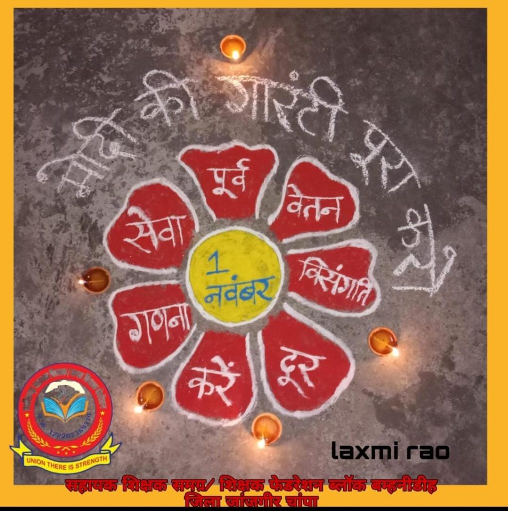 छग शिक्षक संघर्ष मोर्चा के नेतृत्व में पुरानी सेवा गणना, वेतन विसंगति दूर करने ,क्रमोन्नति/पदोन्नति और केंद्र के बराबर देय तिथि से महंगाई भत्ता/एरियर्स को लेकर प्रदेश के शिक्षक कई चरणों मे आंदोलन कर रहे हैं। दीपावली के अवसर पर प्रदेश के शिक्षकों ने अनूठा प्रदर्शन किया, सभी शिक्षकों ने अपनी मांगों को लेकर एक दीप जलाकर शासन और जनमानस को एक सन्देश दिया कि पूर्व सेवा गणना किये बगैर समस्त संविलियन प्राप्त एल बी संवर्ग के शिक्षकों का भविष्य अंधकारमय है,मोदी की गारंटी में सहायक शिक्षकों के वेतन विसंगति को दूर करने का उल्लेख है, क्रमोन्नति और केंद्र के बराबर देय तिथि से मंहगाई भत्ता देने का वादा किया गया है जिसे अब साय सरकार जल्द पूर्ण करे।
